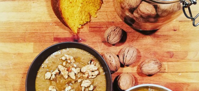 Ho accompagnato la zuppa al pane alla zucca (precedente fatto e congelato: guarda la ricetta: PANE DI ZUCCA) e ho usato delle noci per guarnire (e un filo di olio), per rendere il pasto ancor più completo e nutriente!