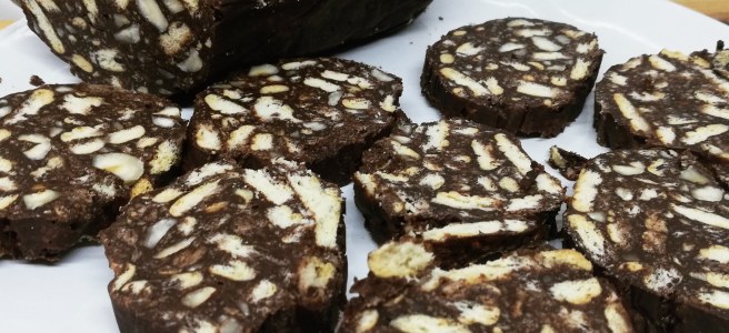 Amalgamare tutto con il cioccolato sciolto e dare la forma di un salame arrotolaldolo su carta da forno e chiudere le estremità come una caramella