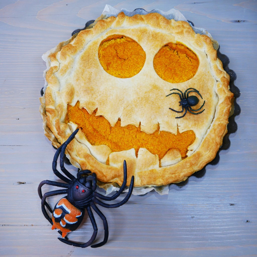 ➡️ Spalmare su pasta sfoglia rotonda (sono quasi tutte vegetali, controllare gli ingredienti), decorare o bucherellare l’altra sfoglia rotonda e chiudere ai bordi