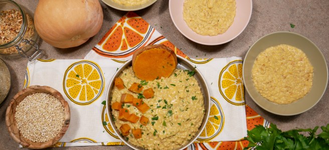 Risottiamo la crema con il sorgo cotto e un pò di acqua calda (o brodo). Ed infine mantechiamo con: